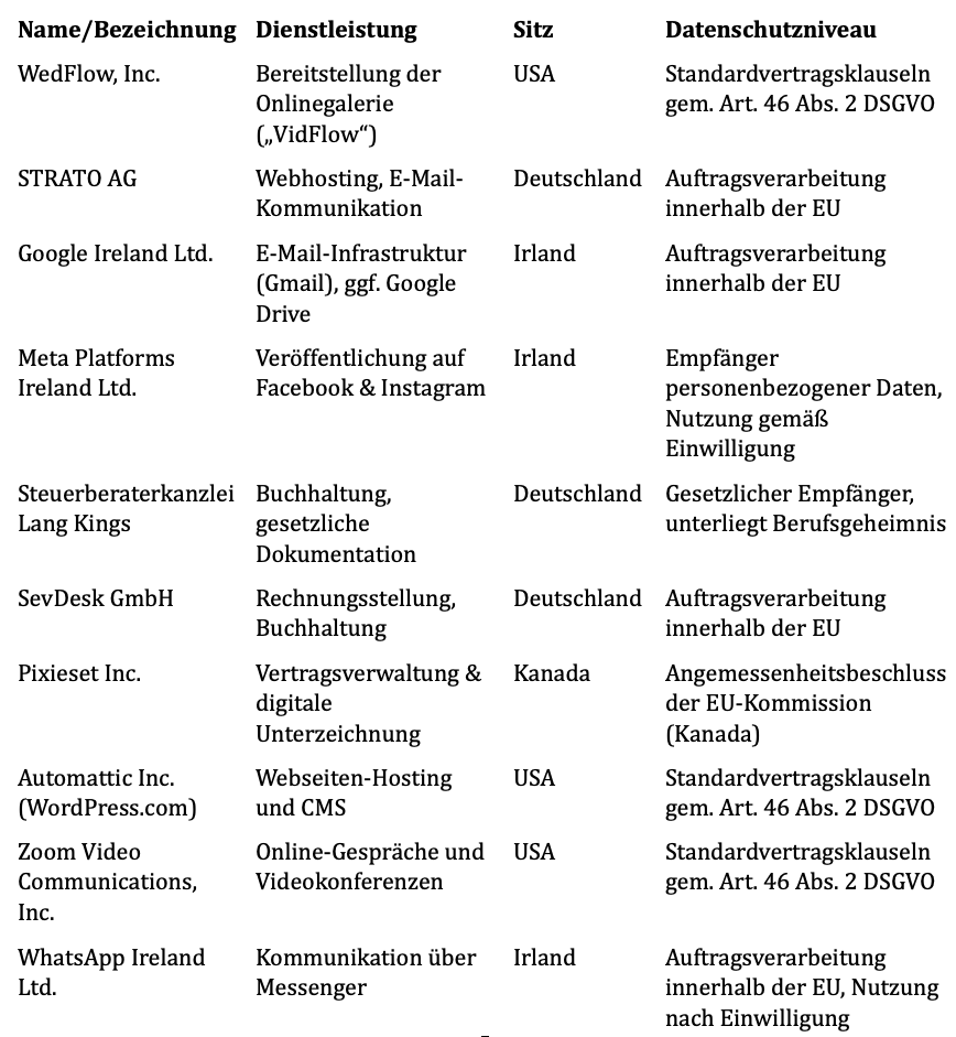 Im Rahmen der Anbahnung und Durchführung des Vertragsverhältnisses verarbeiten wir personenbezogene Daten der Auftraggeber. Dies umfasst insbesondere: Namen, Anschrift, Telefonnummern, E-Mail-Adressen sowie Informationen über die geplante Hochzeit, darunter Details zur Location, zum Tagesablauf und zu anwesenden Gästen. Die Datenverarbeitung erfolgt zum Zweck der bestmöglichen Vorbereitung und Durchführung der vertraglich vereinbarten videografischen Leistungen.